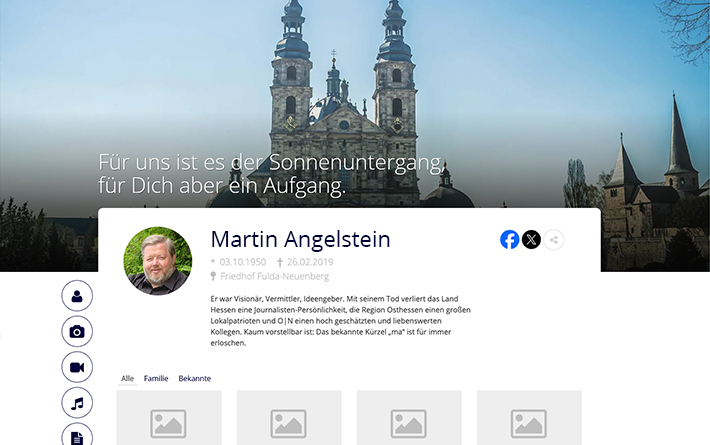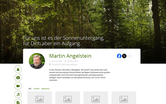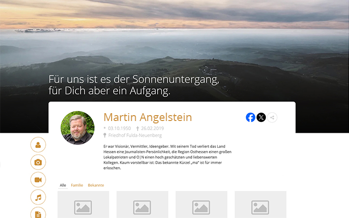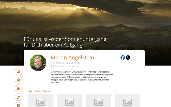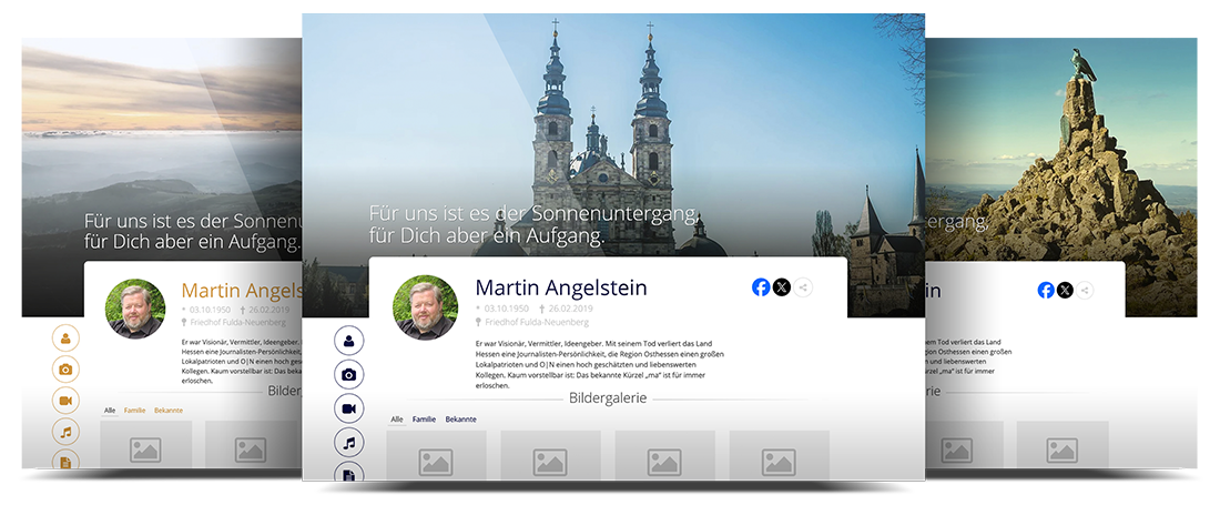 Die Darstellung des Lebenslaufs des Verstorbenen erfolgt über einen Zeitstrahl mithilfe von Bildern und Texten. Zusätzlich können Inhalte von Drittanbietern (YouTube, Instagram, Wikipedia, Twitter u. v. a.) eingebunden werden.